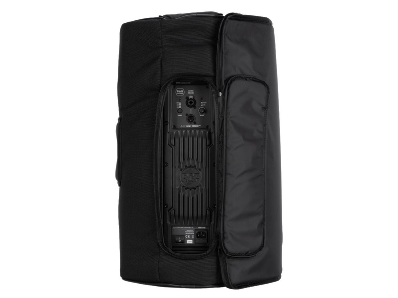 Padded Cover for ART 912-A, ART 9 SERIES. It features heavy-duty weatherproof polyester outer fabric, foam rubber padding, and zip openings with Velcro fasteners. The frontal cover can be opened and blocked with velcro on one side. It features multiple openings for handles, for the rear connection panel, and the pole mount cap.